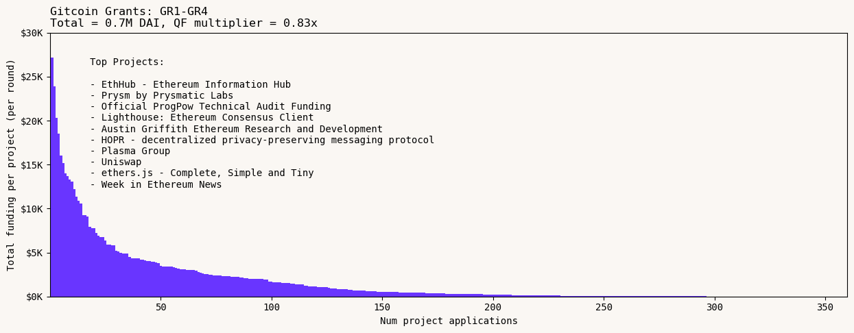 The first four Gitcoin rounds distributed less than $1M (combined) across over 300 applicants, but were very focused on projects directly serving the core Ethereum community.