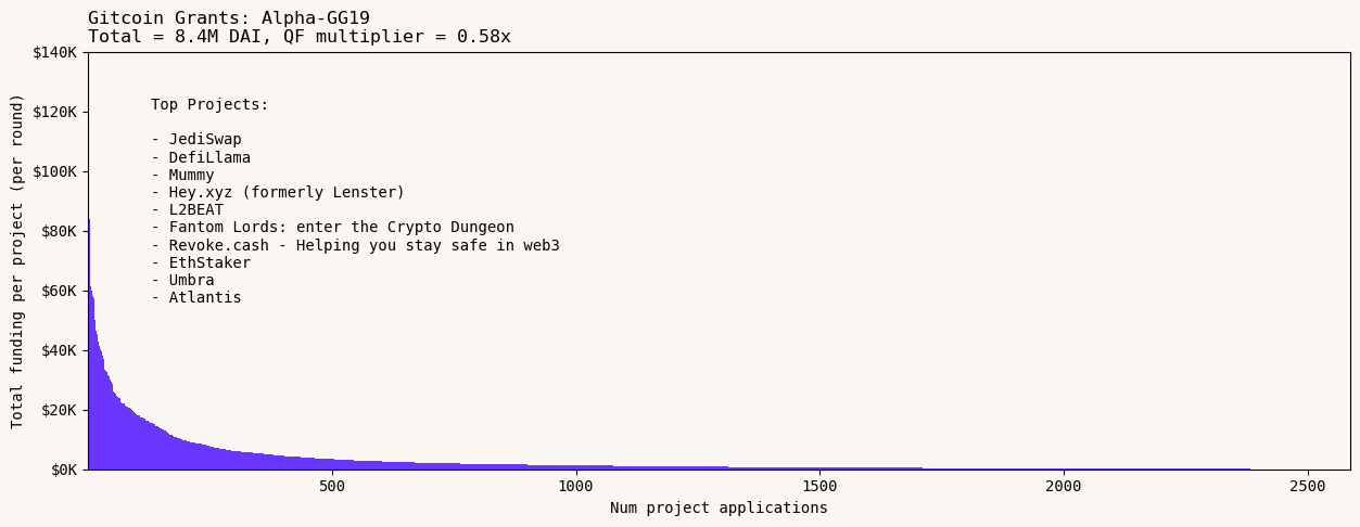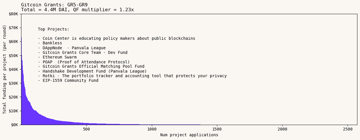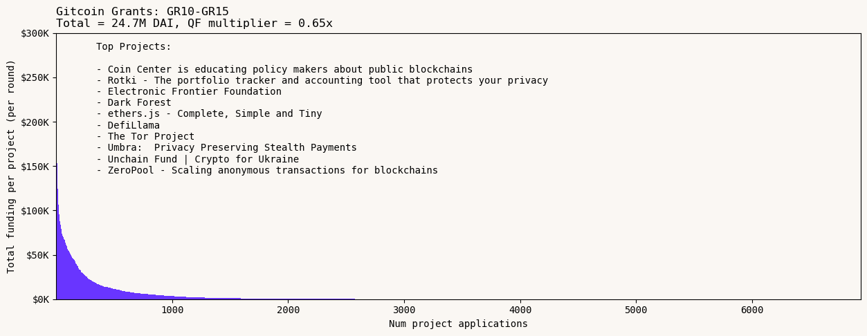 Nearly $25M was distributed to projects -- across an extremely long tail of applicants. These large rounds were significant crowdfunding events, though the multiplier for match funders dropped to around $0.65 on the dollar.