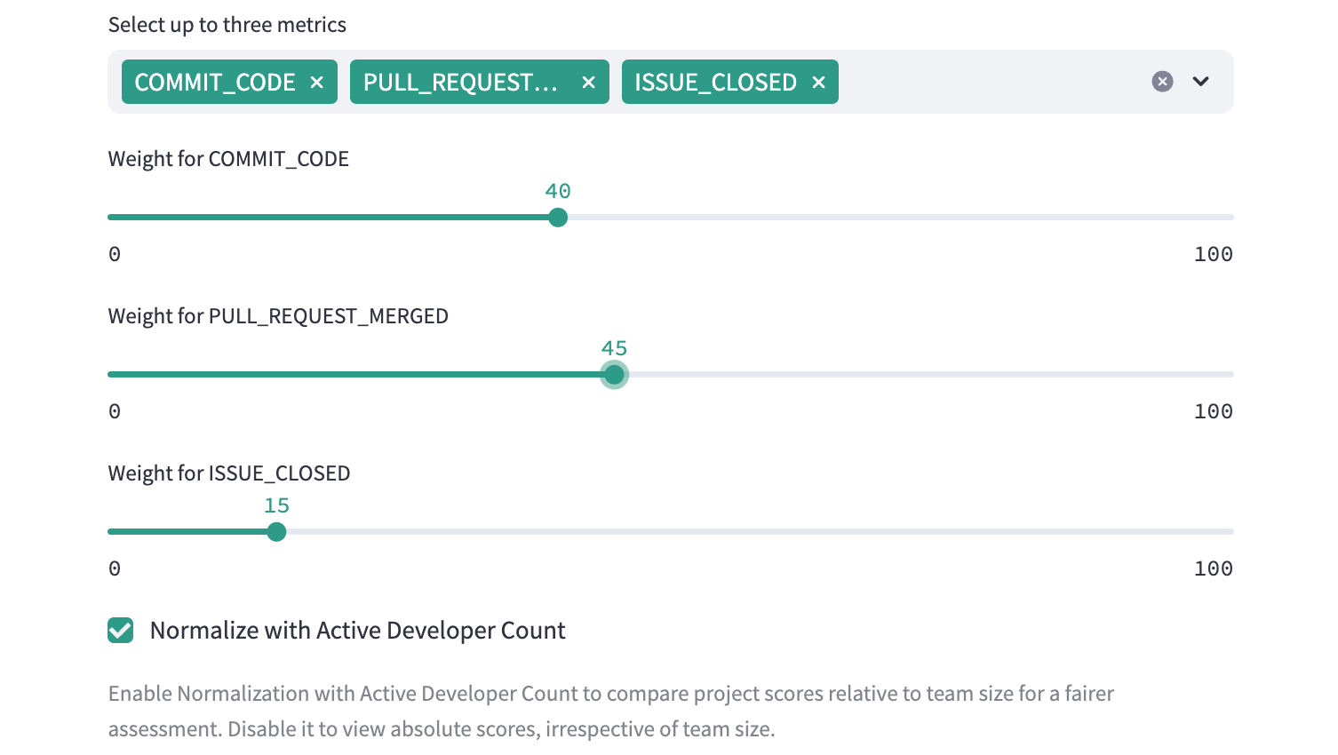 Raw metrics like commits or PRs merged can be insightful but often skew comparisons due to team size differences. Normalizing these metrics to reflect per-developer contributions enables a fair evaluation, highlighting which teams maximize their resources. This approach uncovers high-performing projects, irrespective of their size, offering funders a clearer picture of where their capital can drive the most impact.