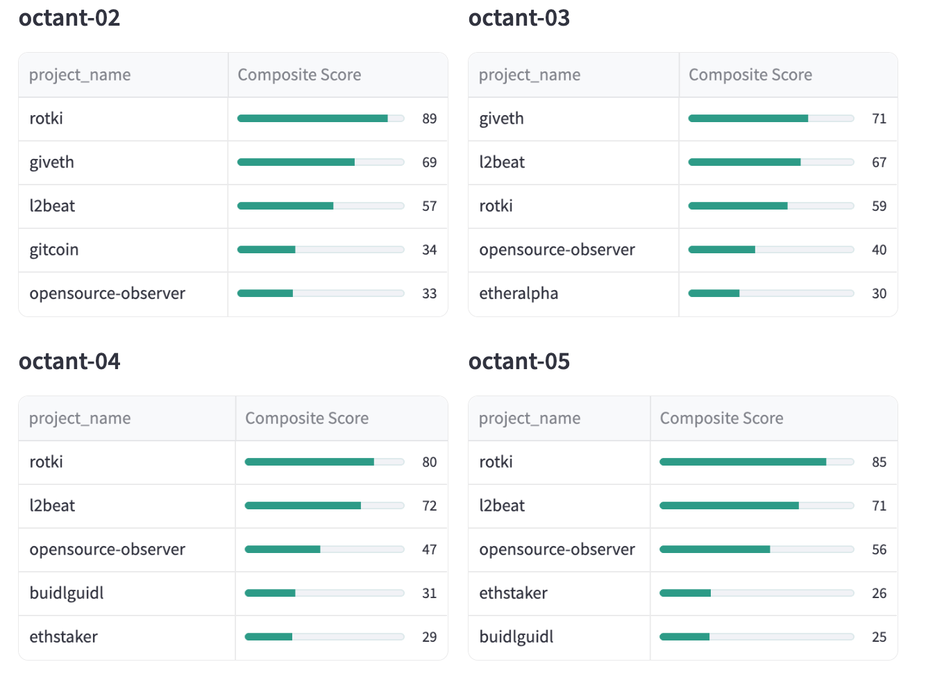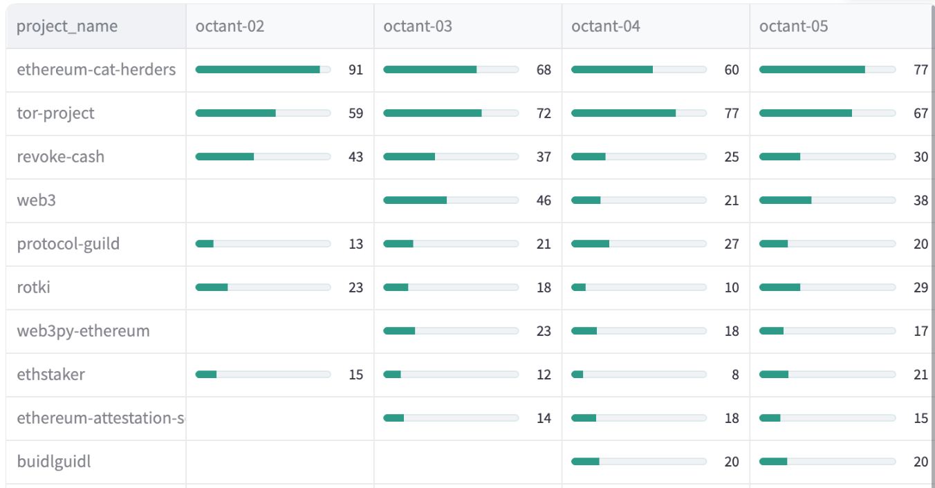 In 2024, Octant supported 47 open source software teams across four epochs. The funded projects have been diverse in scope, ranging from privacy-focused tools like Tor to ecosystem analytics platforms like L2Beat to up-and-coming organizations like the GreenPill Developer Guild.