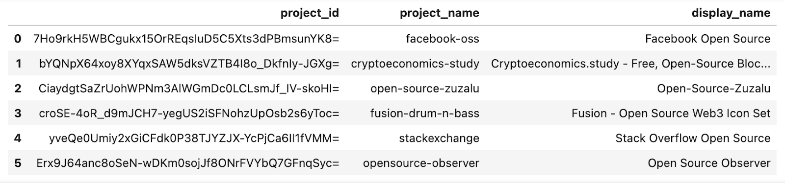 The matching records are displayed as follows. You can utilize the field project_name, say “opensource-observer”, for additional information on the grantee, as shown in the following queries.
