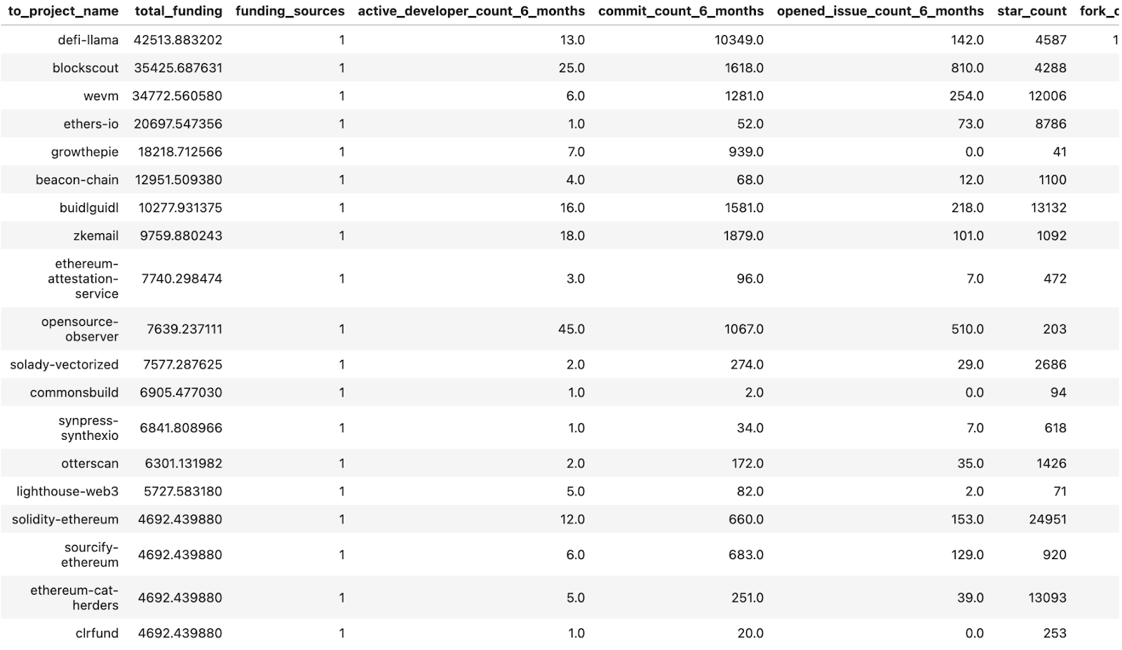 In this example, you can discover the top 20 funded projects from the GG22 Developer Tooling and Libraries round and gain insights into their development activity. View key metrics such as active developers, commits, issues opened, stars, and forks over the past six months, alongside their total funding in the round.