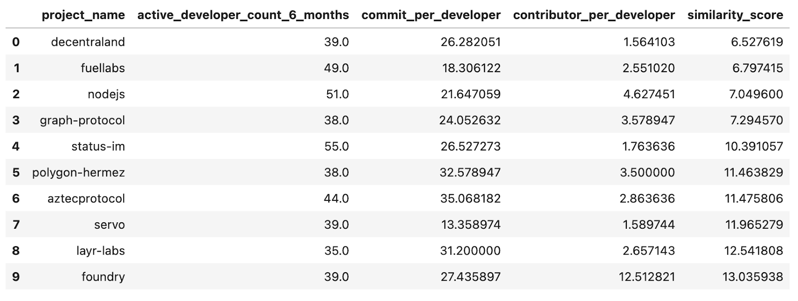 This query compares metrics such as active developers, commits per developer, and contributors per developer to find the top 10 projects most similar to Open Source Observer.