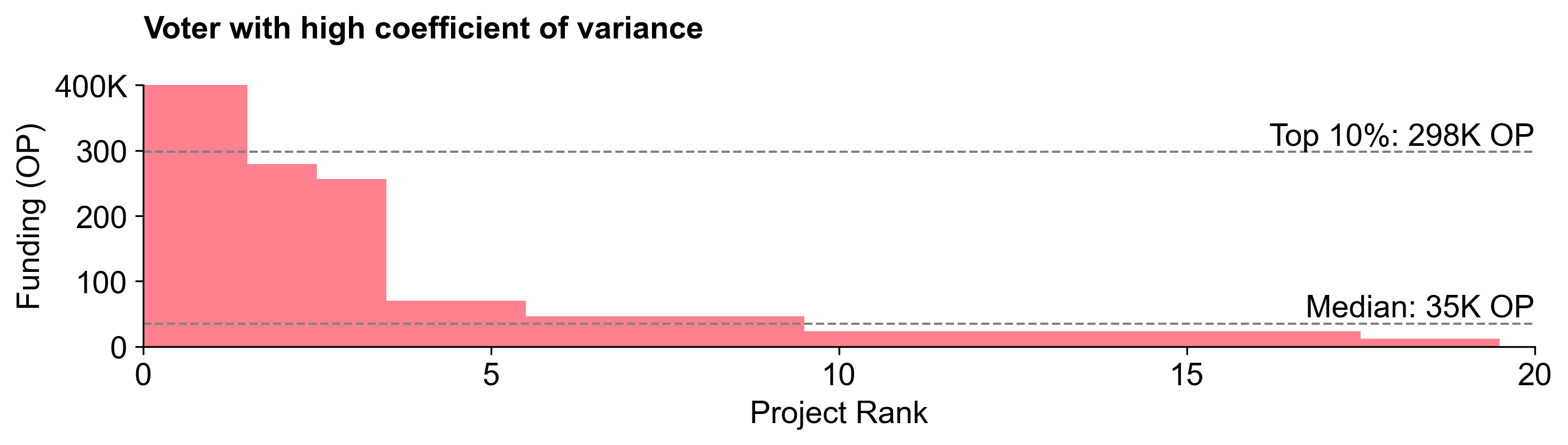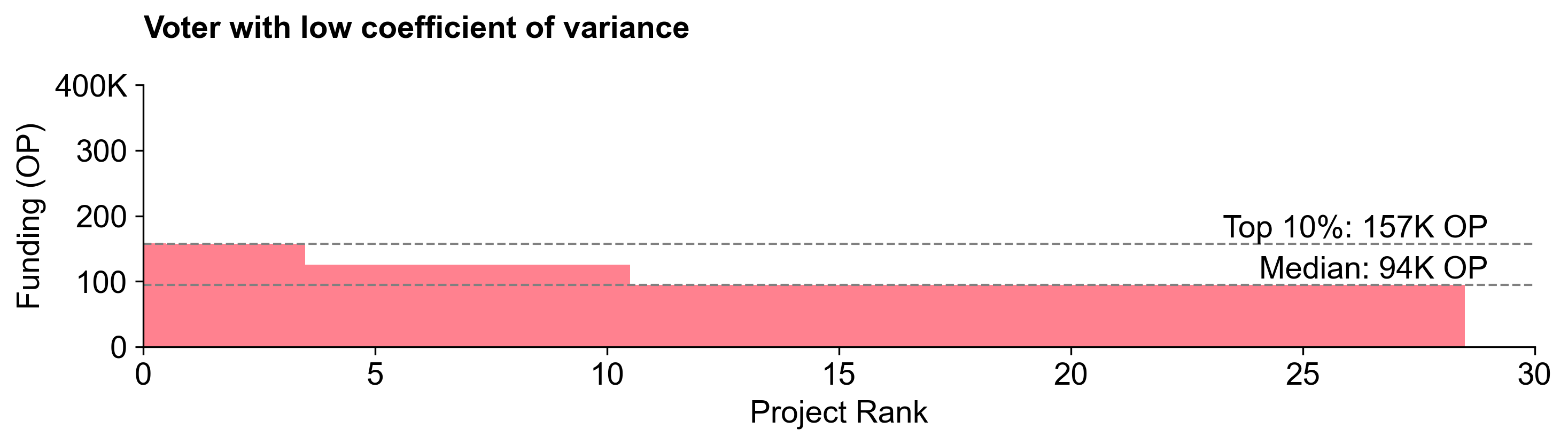 We can quantify vote variance by calculating the coefficient of variation (CV) in the votes cast by each voter. A low CV indicates a voter believed every project deserved a similar allocation, while a high CV suggests more polarized voting behavior (favoring certain projects heavily). Below, we illustrate the difference between flatter and steeper distributions with two example voters.