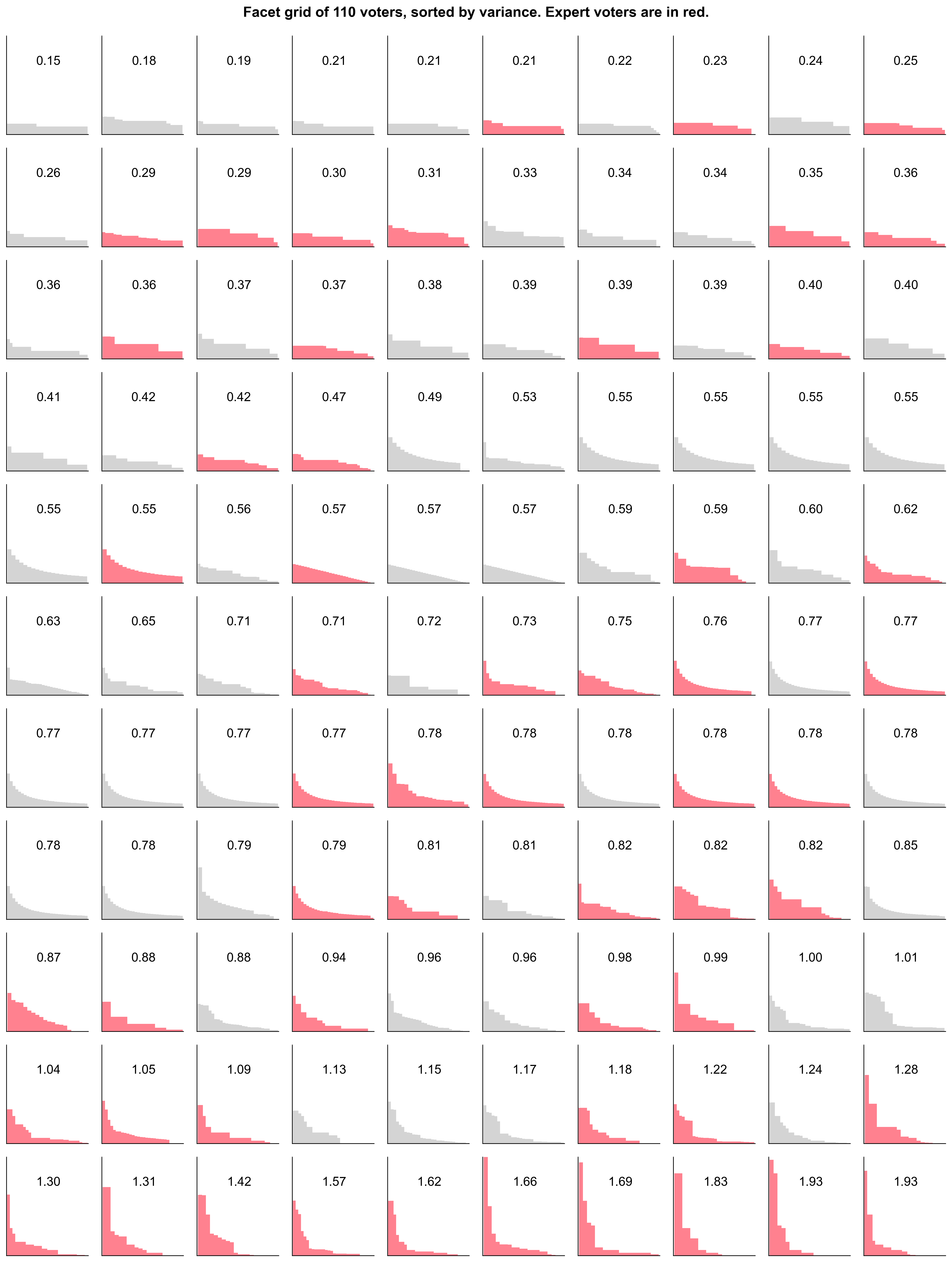 Now, let’s look at the CV across all 110 voters, with experts highlighted in red. (Note: I've ommitted the chad 111th voter who had the highest CV in order to make the chart look nicer.)