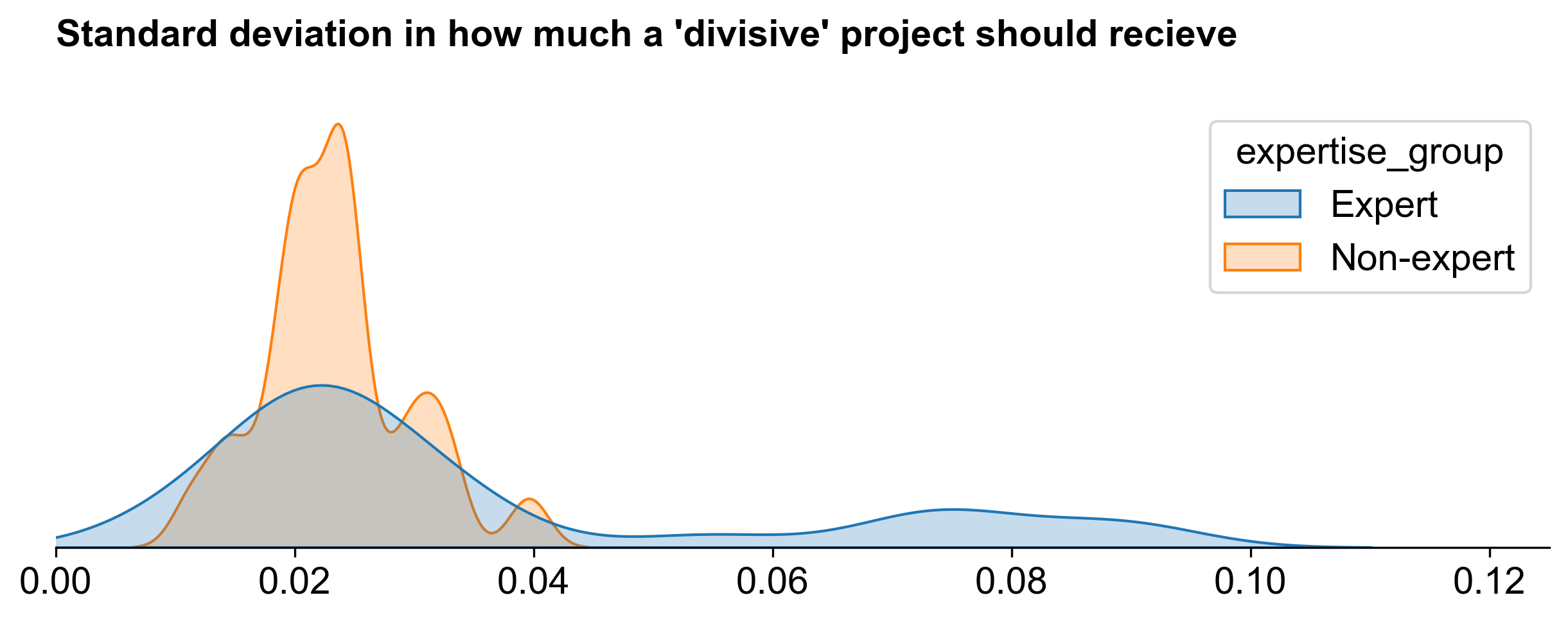 Experts’ high-assertion votes — where they allocated a significant percentage of the pool to a project they knew well — were a key factor in shaping the results. The variance between experts and non-experts is visualized below, showing the most divisive projects and the difference in standard deviation between groups.
