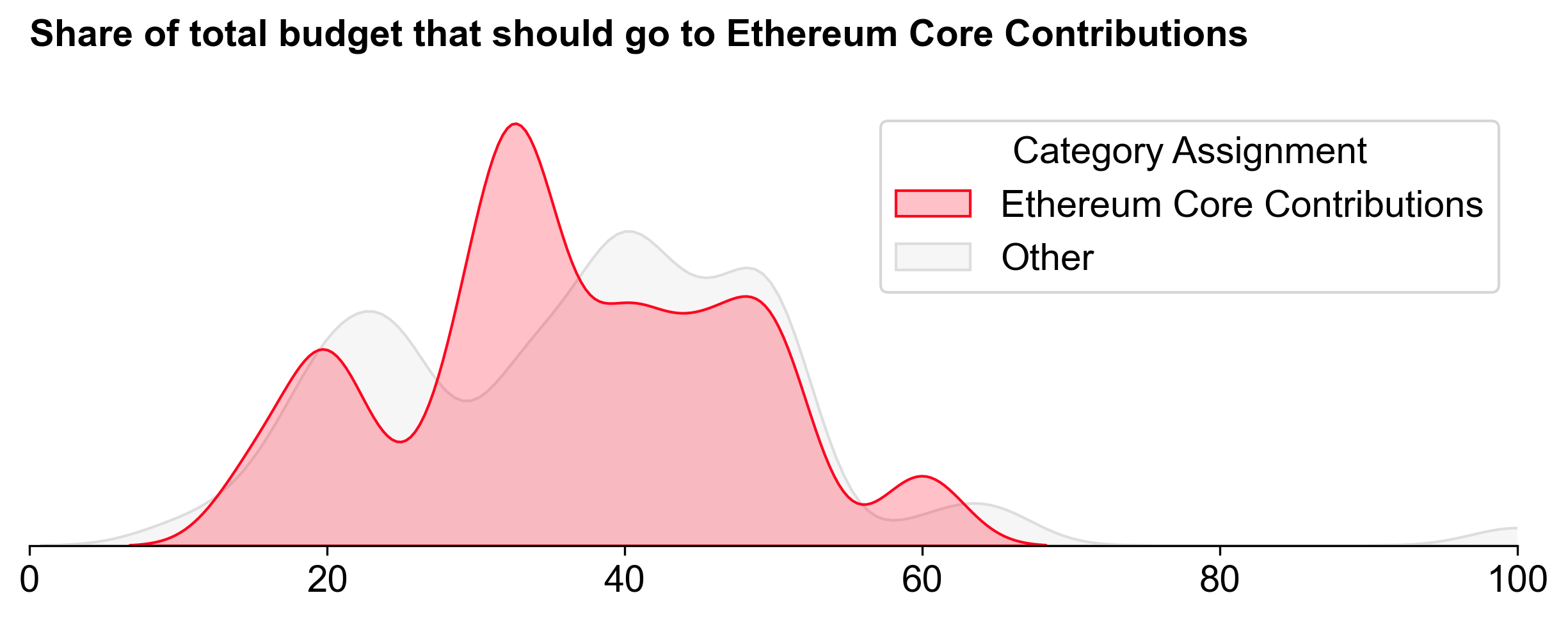 Voters assigned to Ethereum Core Contributions generally allocated less budget to the category than those assigned to the other categories.