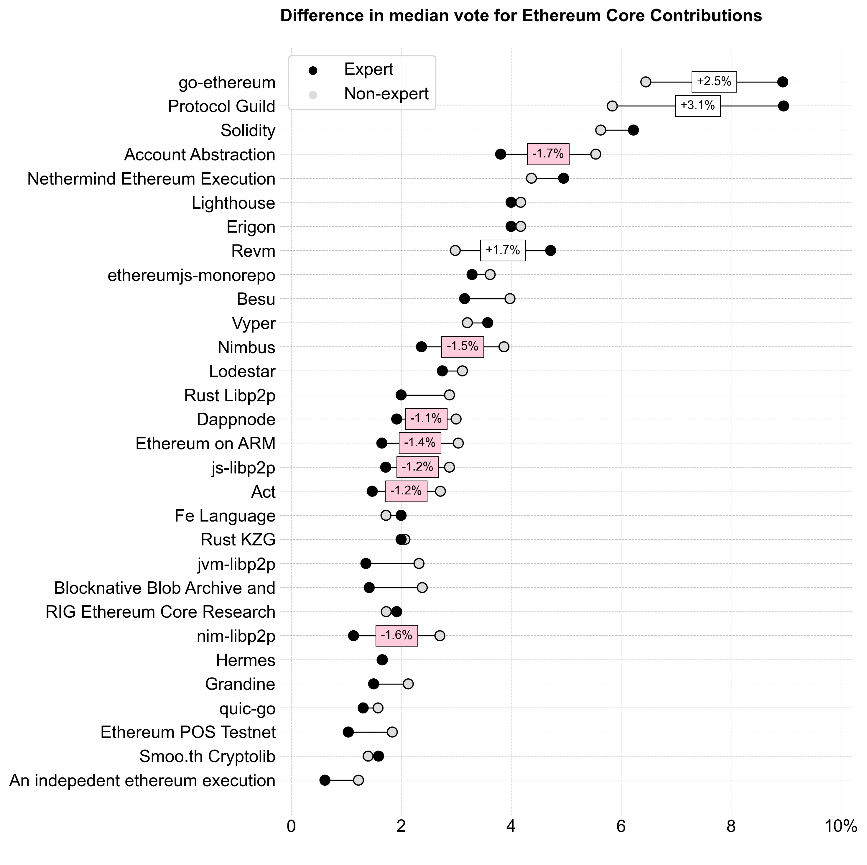 The key difference between experts and non-experts was at the top of the distribution, where experts favored go-ethereum and Protocol Guild more heavily.