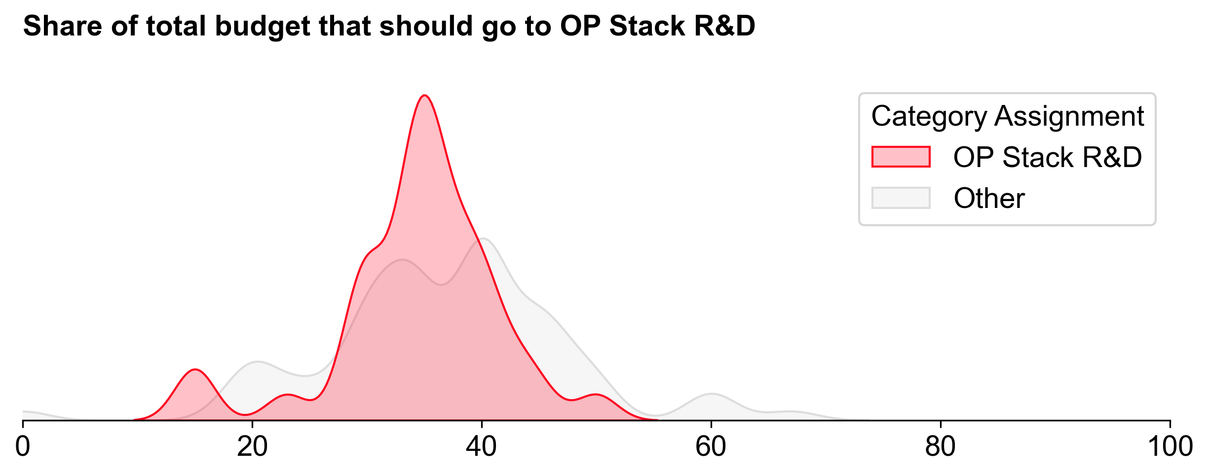 OP Stack R&D ranked second overall in terms of funding, with 2.8M OP (~35%). There was much more consensus on the percentage of the budget to allocate to this category, and little variance between people assigned to this category and assigned to the others.