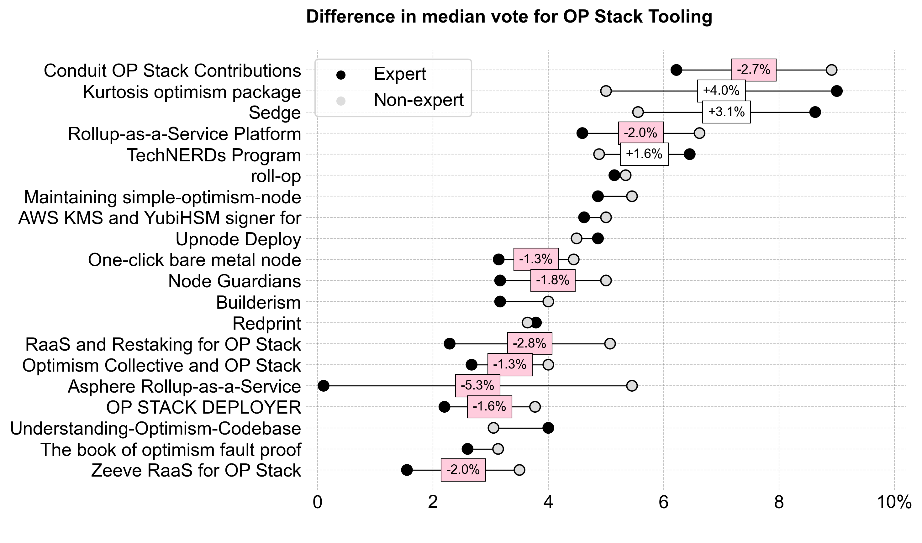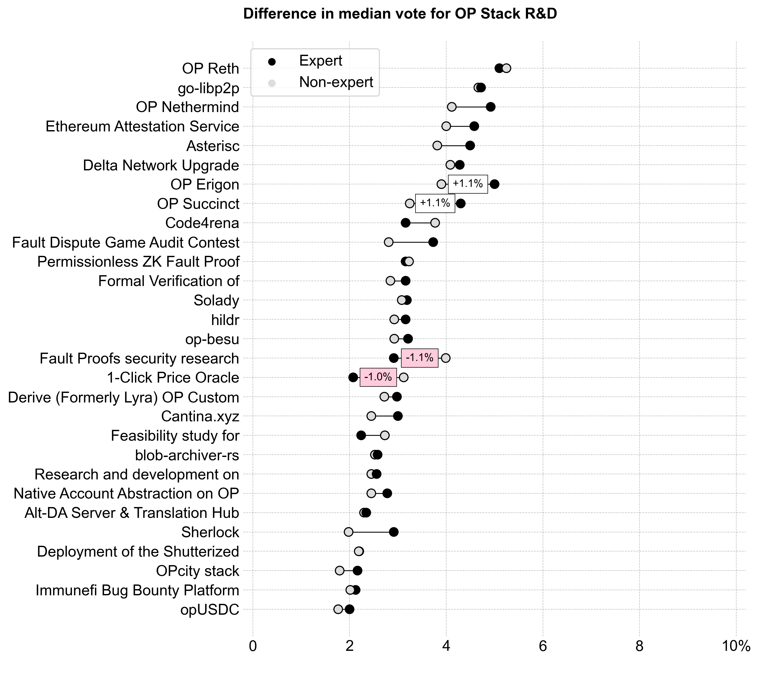 Interestingly, experts and non-experts had the smallest difference in their voting patterns for OP Stack R&D. Even experts may have struggled to differentiate projects in this category.