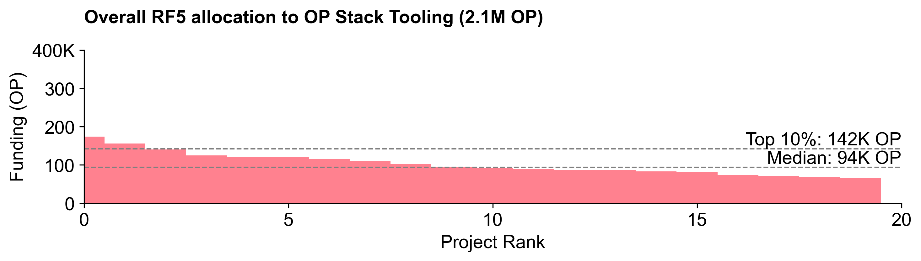 In fact, this was the flattest distribution of all five RF rounds. The top project, go-ethereum, received 235K OP (2.9% of the total). The median project received 93K. Even the lowest ranked project in Round 5 received 37K - more than what 70% of the projects in Round 4 received. It was a good round to be an “average” project in.