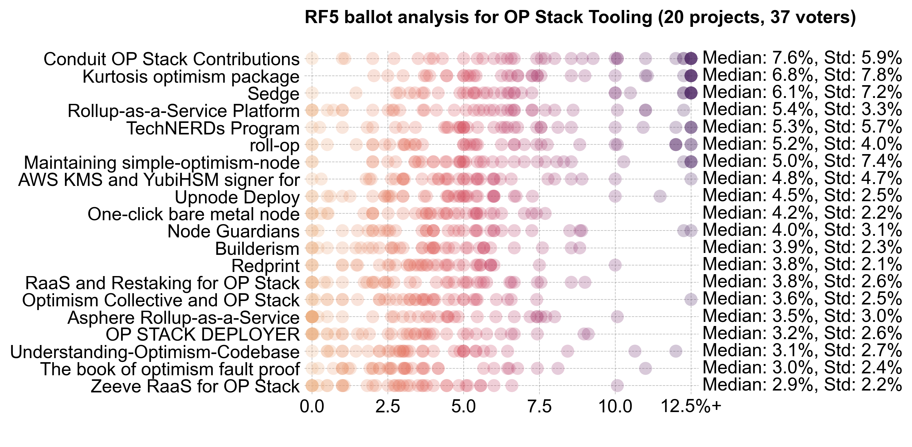 This provides additional context for the outliers in the distribution. Here is a variant on the ballot analyses shown previously, using OP Stack Tooling as an example. This version shows the implied allocation (instead of the percentage of the total pool) that the voter intended to reward the project with. The standard deviation of these absolute values is very high, and virtually every project has at least one vote equating to 200K OP or more.