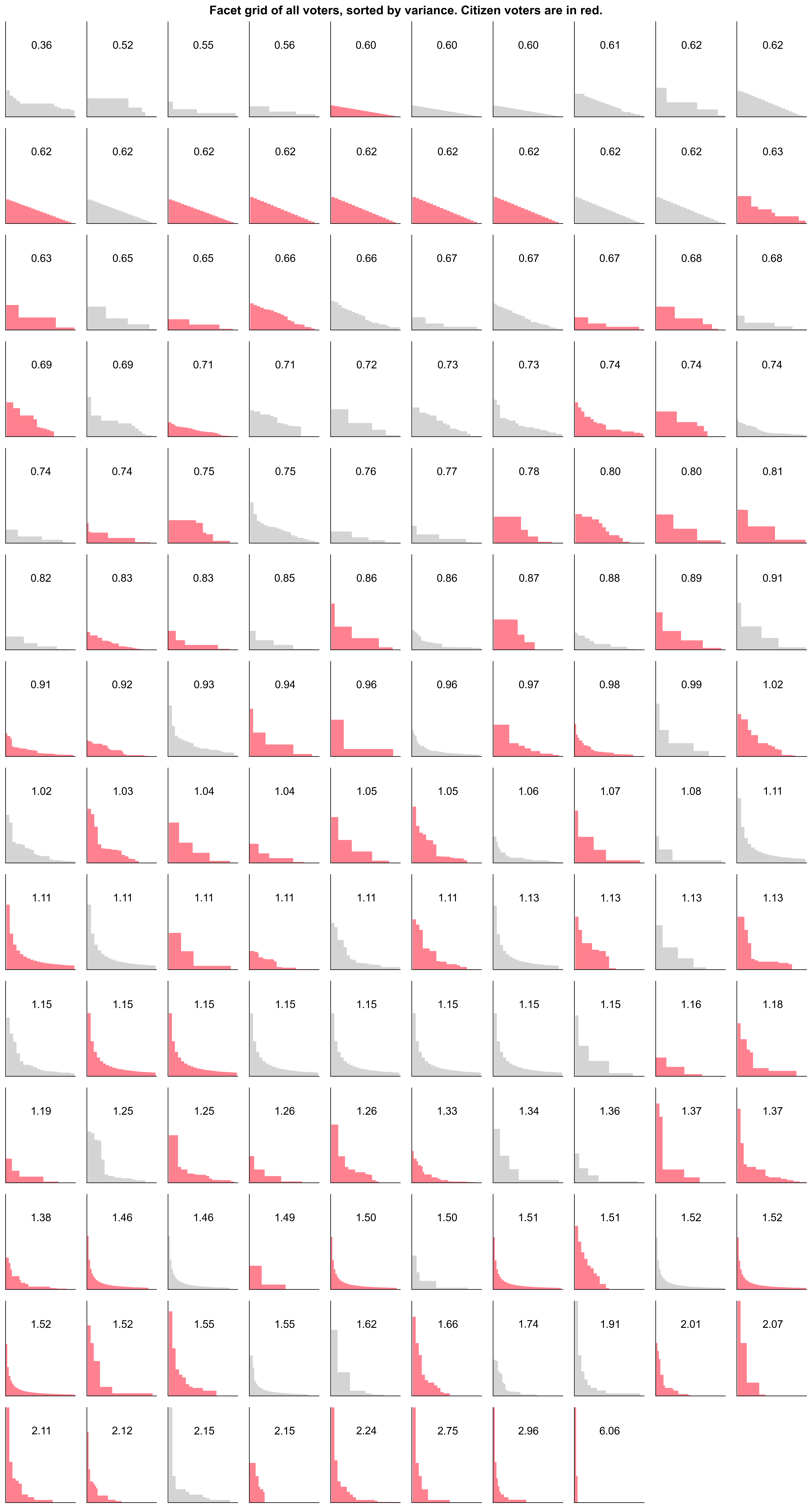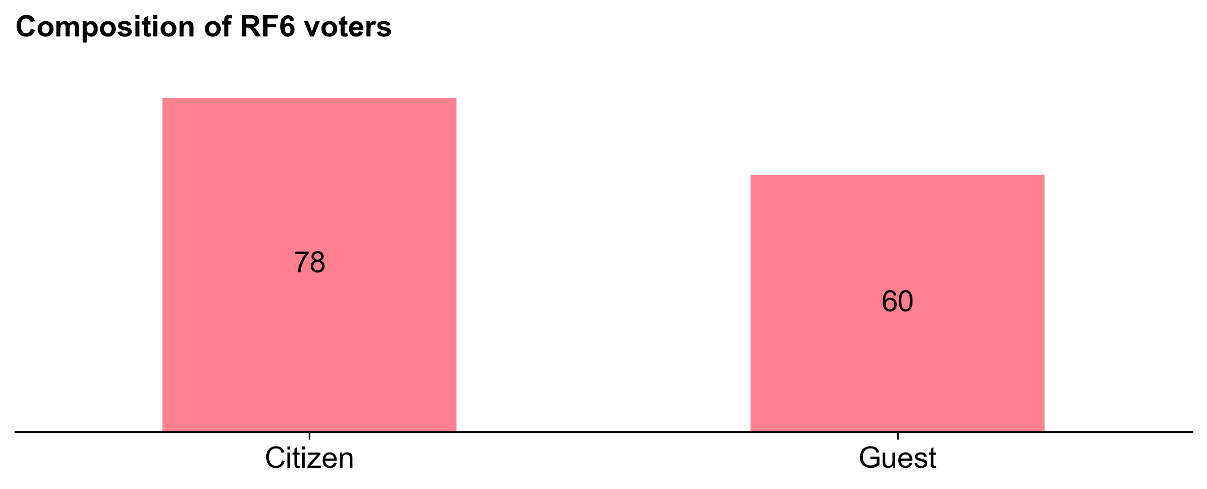Unlike the ballots in RF5, most voters in RF6 did not vote for flat distributions. Citizens tended to vote for steeper distributions than guest voters.