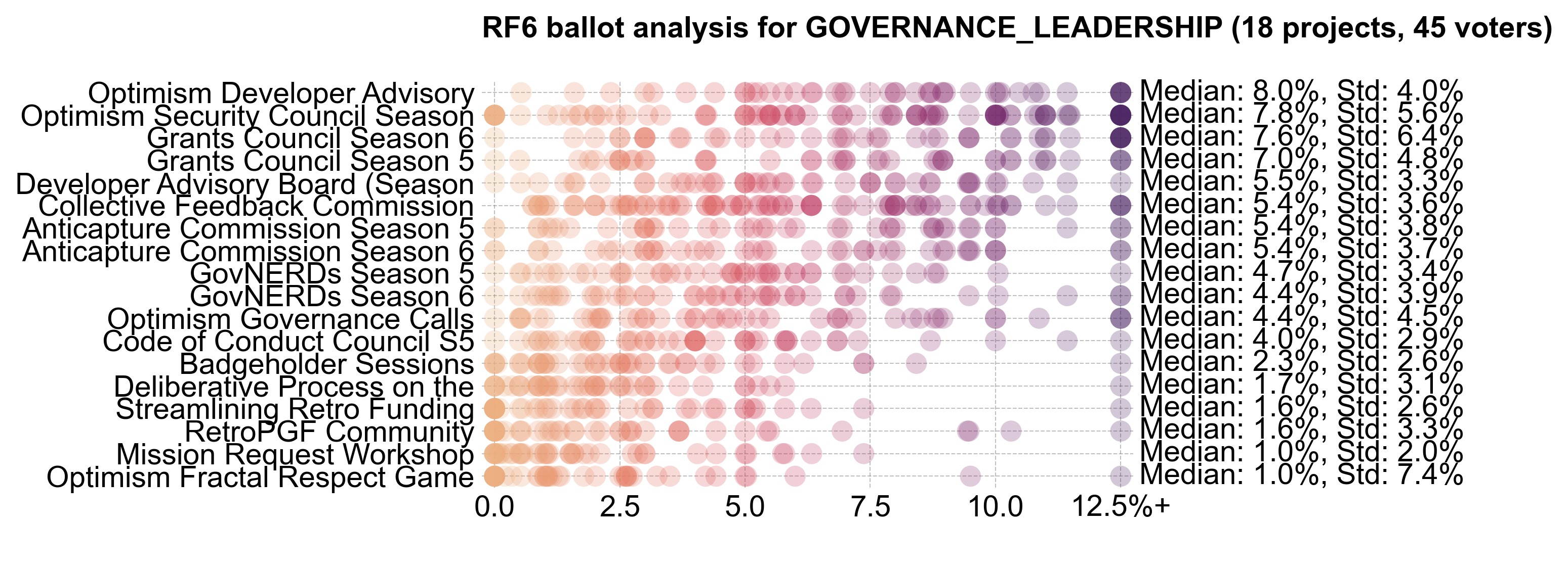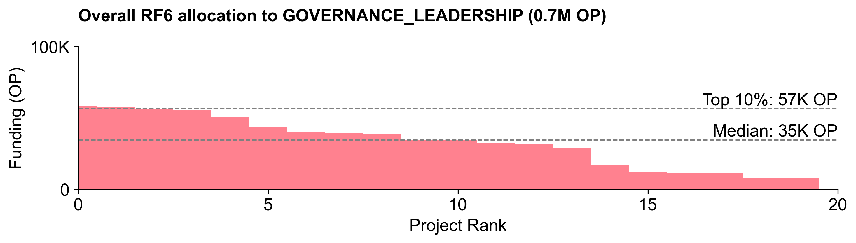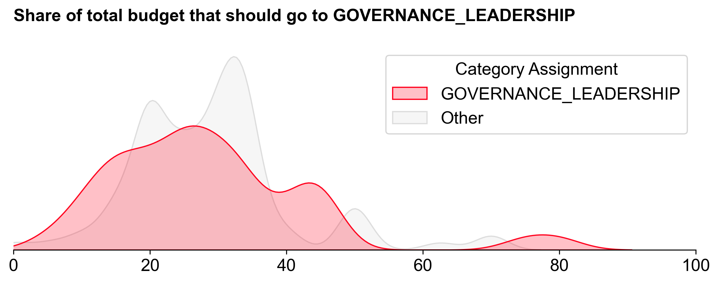 Governance Leadership ranked third overall in terms of funding, with 671K OP (~28%). There was a wide range of opinions about how much budget to allocate to this category.
